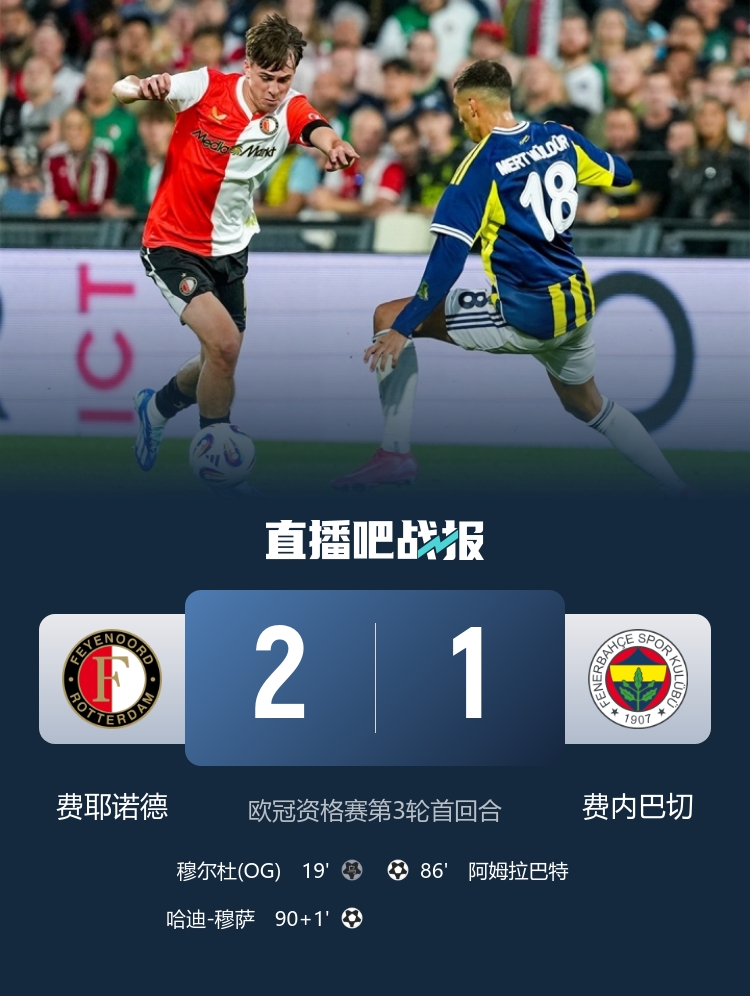 8月7日訊 歐冠資格賽第3輪首回合,費(fèi)耶諾德坐鎮(zhèn)主場(chǎng)費(fèi)耶諾德球場(chǎng)迎戰(zhàn)費(fèi)內(nèi)巴切。上半場(chǎng),廷伯造烏龍為費(fèi)耶諾德首開(kāi)紀(jì)錄,費(fèi)內(nèi)巴切進(jìn)球被吹。易邊再戰(zhàn),阿姆拉巴特爆射扳平,穆薩補(bǔ)時(shí)絕殺。最終費(fèi)耶諾德2-1費(fèi)內(nèi)巴切,次回合將于13日凌晨進(jìn)行。