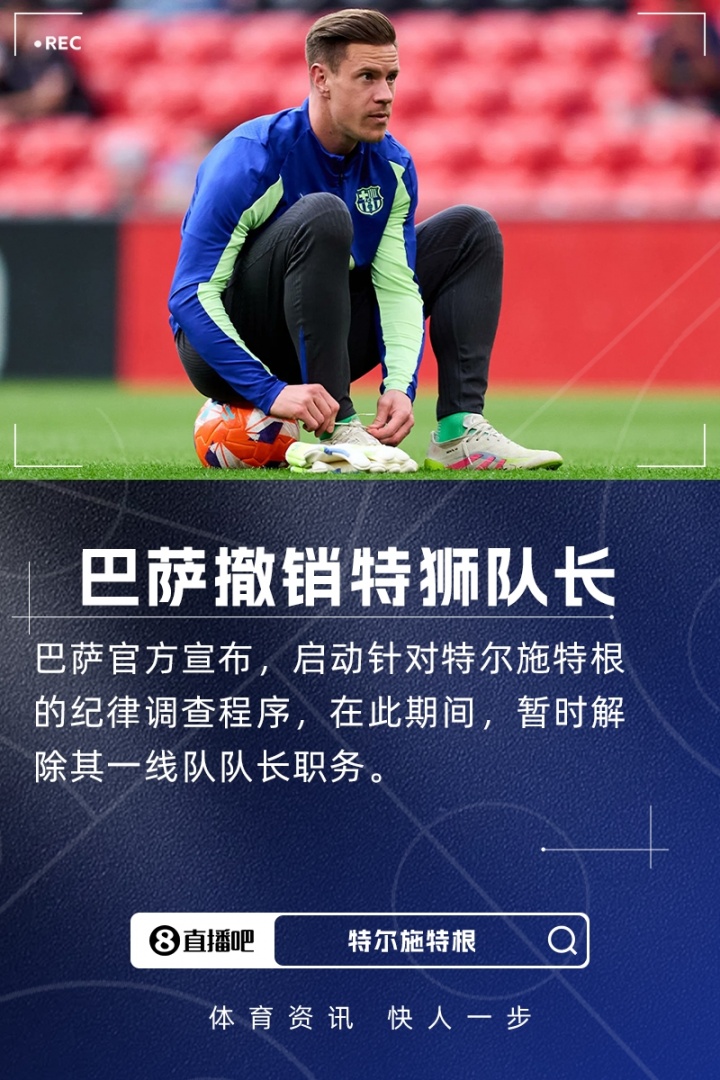 巴塞羅那足球俱樂(lè)部宣布,由于對(duì)球員特爾施特根啟動(dòng)的紀(jì)律調(diào)查程序,在該程序最終解決之前,俱樂(lè)部在與體育管理層和技術(shù)團(tuán)隊(duì)達(dá)成一致后,決定暫時(shí)撤銷其一線隊(duì)隊(duì)長(zhǎng)的職務(wù)。