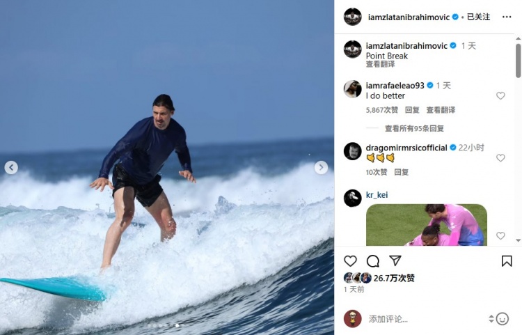 8月9日訊 AC米蘭名宿、紅鳥顧問(wèn)伊布拉希莫維奇日前在社交媒體曬出自己沖浪的照片,萊奧見到后評(píng)論表示自己更強(qiáng)。
