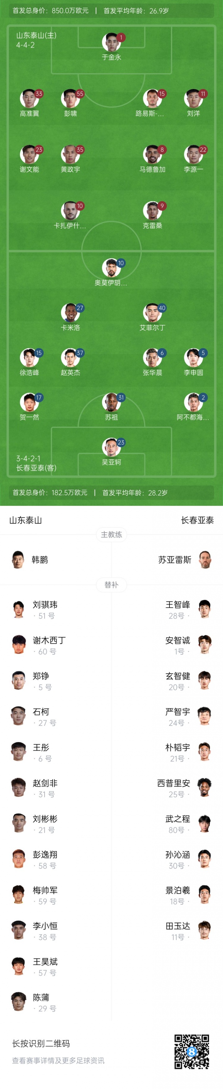 08月09日訊 今晚19:00中超第20輪,泰山vs亞泰。賽前雙方公布了首發(fā)名單。