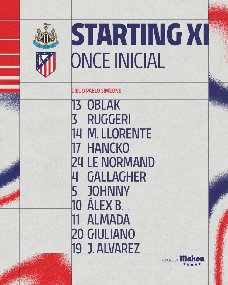 馬競(jìng)首發(fā):13-奧布拉克、3-魯杰里、14-馬科斯-略倫特、17-漢茨科、24-勒諾爾芒、4-加拉格爾、5-卡爾多索、10-巴埃納、11-阿爾馬達(dá)、20-朱利亞諾-西蒙尼、19-阿爾瓦雷斯