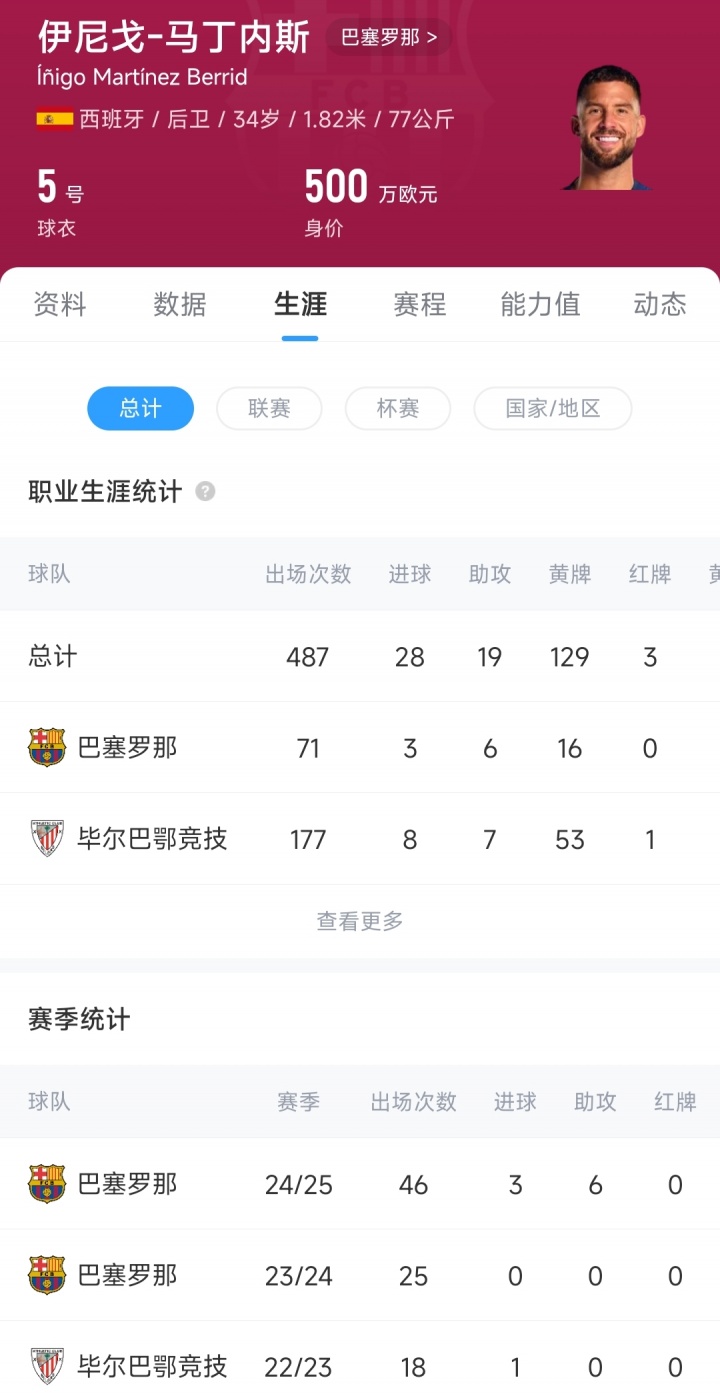 34歲的西班牙后衛(wèi)伊尼戈-馬丁內斯,2023年7月自由身加盟巴薩,兩個賽季共代表巴薩出戰(zhàn)71場比賽,打進3球并送出6次助攻。目前伊尼戈-馬丁內斯的德轉身價為500萬歐元。