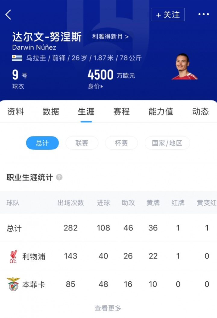 努涅斯自2022年從本菲卡轉(zhuǎn)會(huì)以來(lái),共為利物浦出場(chǎng)143次。上賽季他出戰(zhàn)了30場(chǎng)聯(lián)賽,但其中僅8次首發(fā),并在球隊(duì)贏得英超冠軍的賽季中打入5球。努涅斯現(xiàn)年26歲,目前德轉(zhuǎn)估值4500萬(wàn)歐。