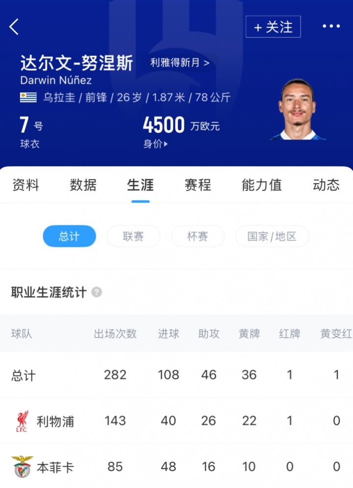 努涅斯自2022年從本菲卡轉(zhuǎn)會以來,共為利物浦出場143次。上賽季他出戰(zhàn)了30場聯(lián)賽,但其中僅8次首發(fā),并在球隊贏得英超冠軍的賽季中打入5球。努涅斯現(xiàn)年26歲,目前德轉(zhuǎn)估值4500萬歐。