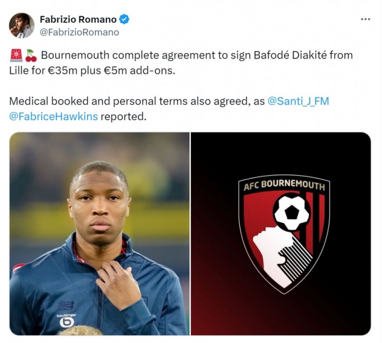 羅馬諾透露,伯恩茅斯敲定里爾中衛(wèi)迪亞克特,兩家俱樂部已經(jīng)就3500萬歐+500萬歐浮動的轉(zhuǎn)會費達(dá)成協(xié)議。