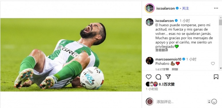 伊斯科社媒寫道:“骨頭可能斷裂,但我的態(tài)度、力量和回歸的決心……這些永遠(yuǎn)不會(huì)動(dòng)搖。非常感謝大家的鼓勵(lì)信息和關(guān)愛,這讓我感到非常幸運(yùn)。”