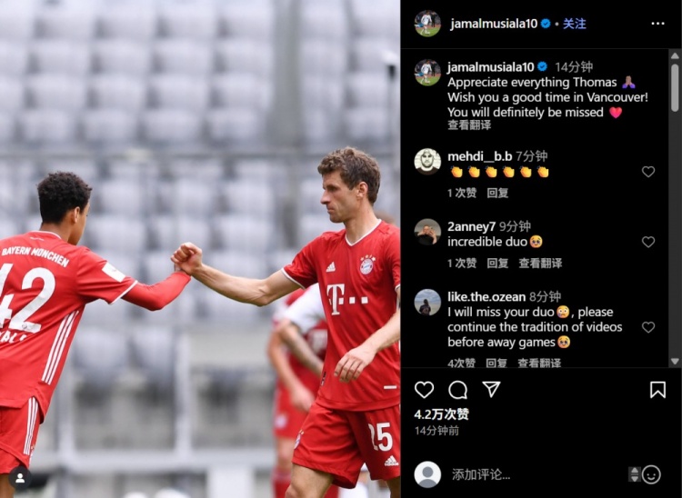 穆西亞拉祝福穆勒:感謝你所做的一切,祝你在溫哥華一切順利
