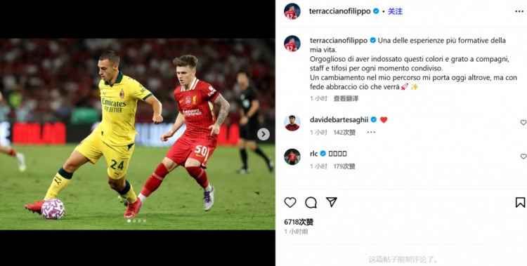 8月12日訊 米蘭后衛(wèi)泰拉恰諾租借加盟克雷莫納,他在社交媒體上對米蘭進行了道別。