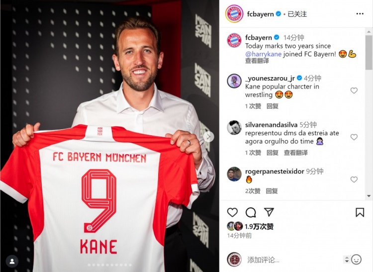 2023年8月12日,凱恩以9500萬歐轉(zhuǎn)會費從熱刺加盟拜仁。拜仁官方社媒曬出凱恩加盟時的照片,回顧那個特別的時刻。