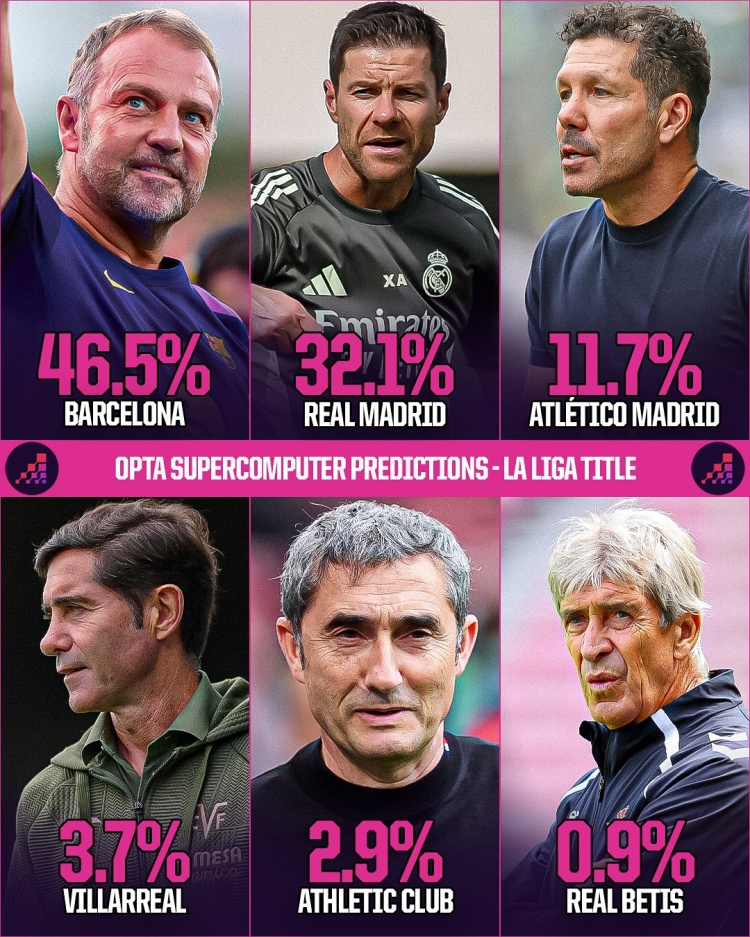 ■以下是Opta超級計算機預(yù)測新賽季西甲冠軍歸屬概率: