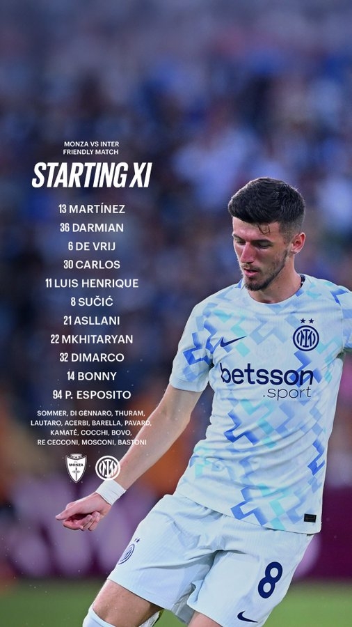 國米首發(fā):13-何塞普-馬丁內(nèi)斯、36-達(dá)米安、6-德弗里、30-奧古斯托、8-蘇西奇、1-阿斯拉尼、22-姆希塔良、32-迪馬爾科、11-恩里克、14-博尼、94-F-埃斯波托尼