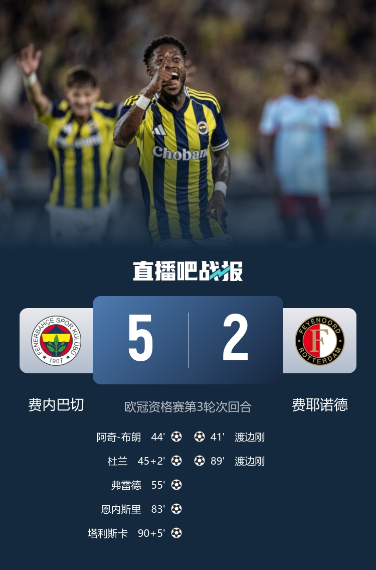 8月13日訊 北京時(shí)間8月13日01:00,歐冠資格賽第三輪次回合費(fèi)內(nèi)巴切迎戰(zhàn)費(fèi)耶諾德的比賽在薩拉克格魯球場(chǎng)進(jìn)行,上半場(chǎng)杜蘭失良機(jī),恩內(nèi)斯里破門(mén)無(wú)效,渡邊剛頭球反客為主,阿奇布朗頭球扳平比分,杜蘭抽射反超比分,下半場(chǎng)弗雷德超級(jí)世界波破門(mén),恩內(nèi)斯里低射破門(mén),渡邊剛抽射扳回一城,塔利斯卡替補(bǔ)建功鎖定勝局,最終費(fèi)內(nèi)巴切5-2總比分6-4逆轉(zhuǎn)費(fèi)耶諾德成功晉級(jí)。