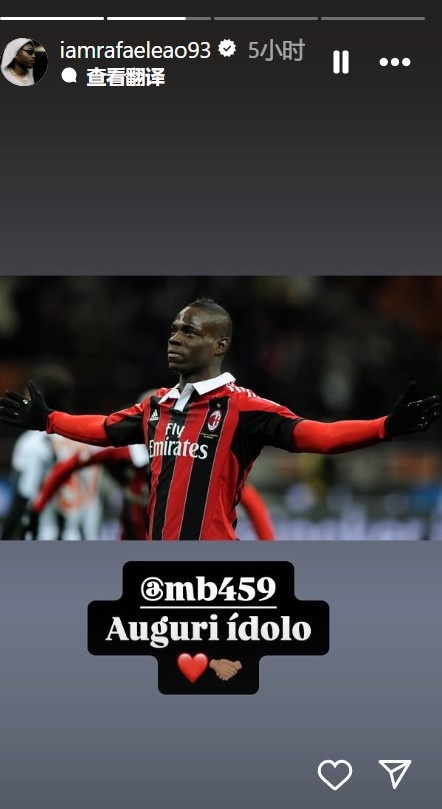 萊奧在社交媒體上曬出了巴洛特利身穿米蘭球衣的照片,配文寫道:“祝賀你,偶像!”