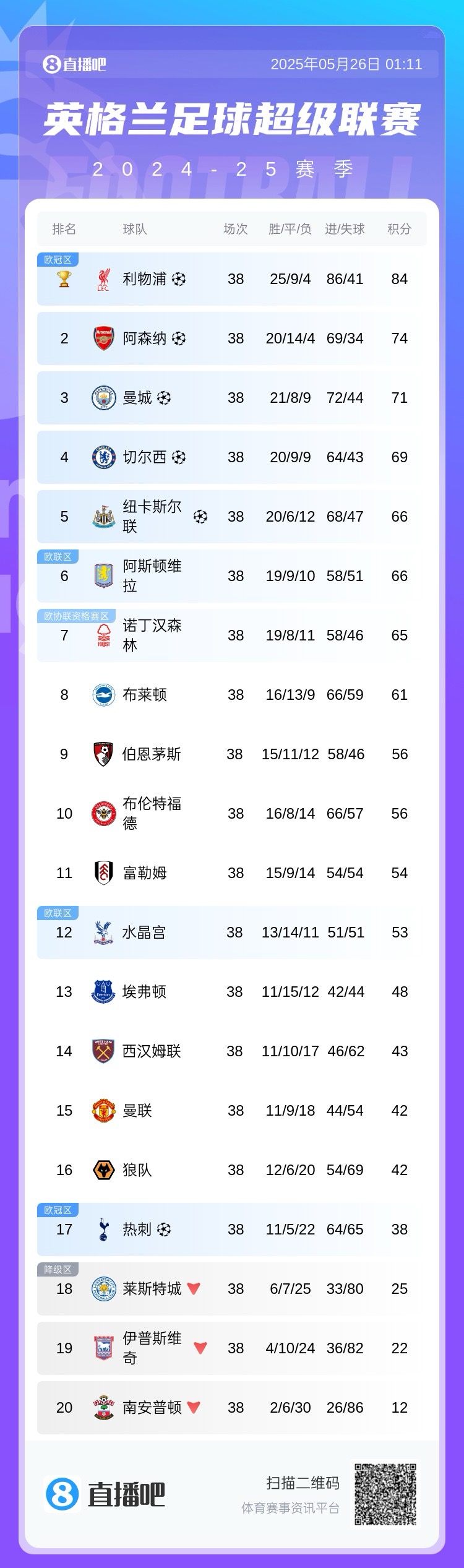 25/26賽季英超20隊(duì):