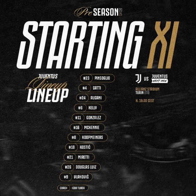 尤文首發(fā):23-平索里奧、4-加蒂、6-凱利、8-庫普梅納斯、9-弗拉霍維奇、11-尼古拉斯-岡薩雷斯、16-麥肯尼、18-科斯蒂奇、21-米雷蒂、24-魯加尼、26-道格拉斯-路易斯
