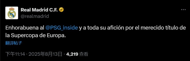 皇馬官方:祝賀巴黎及其所有球迷,贏得實至名歸的歐洲超級杯冠軍