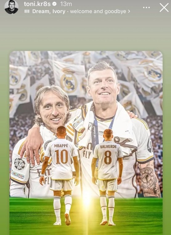 在社交媒體上,克羅斯曬出了自己和莫德里奇、姆巴佩和巴爾韋德的特效合成圖,并寫道:夢(mèng)想和榮耀,歡迎和告別!