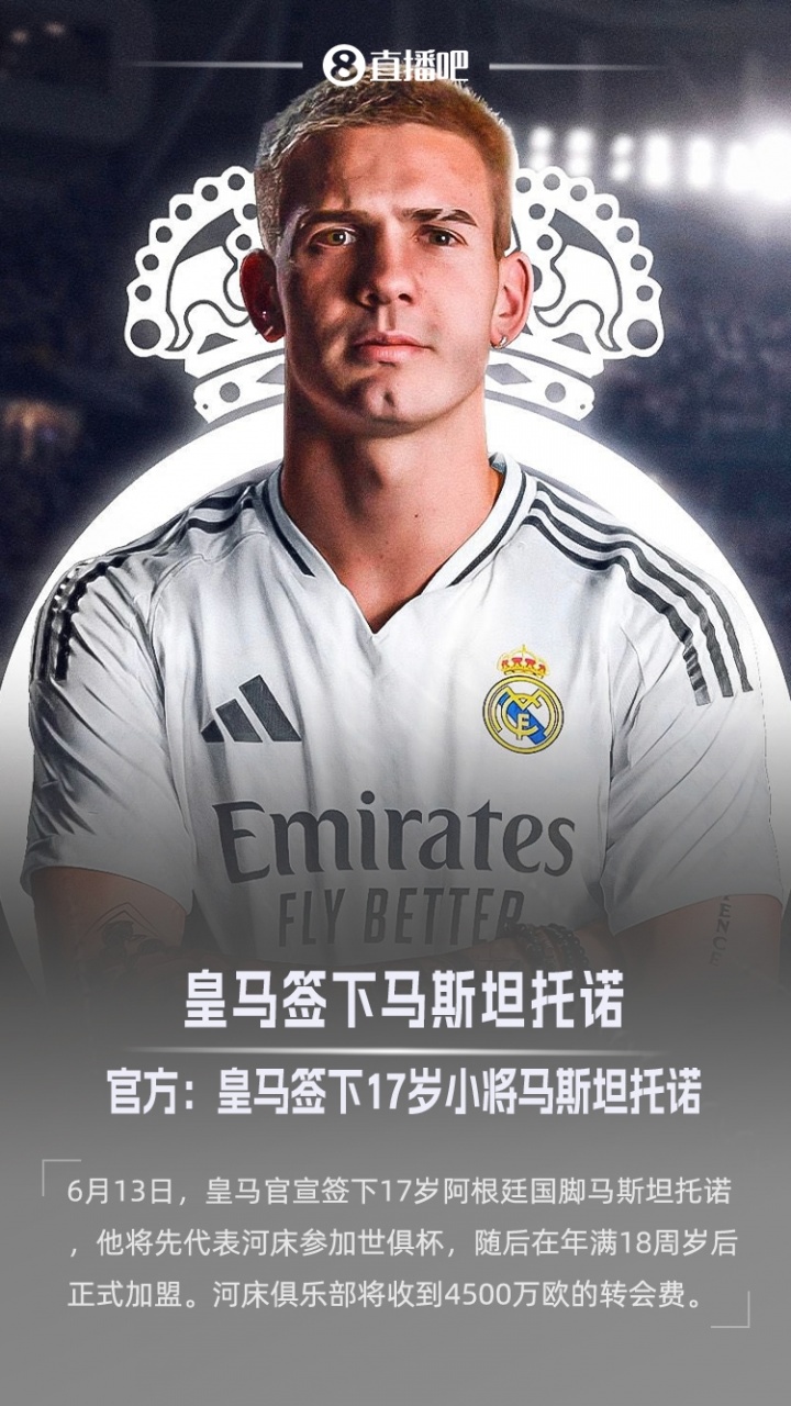 馬斯坦托諾今夏從河床加盟皇馬,據(jù)悉轉(zhuǎn)會費4500萬歐元,這位阿根廷小將今天迎來了18歲生日,皇馬將于今晚19點(當(dāng)?shù)貢r間13點)為他舉辦亮相儀式。