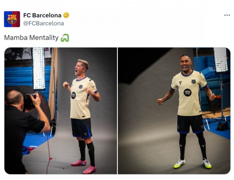 巴薩官方社媒曬出萊萬、拉菲尼亞身穿科比聯(lián)名球衣定妝照片,配文:“曼巴精神?!?/p>