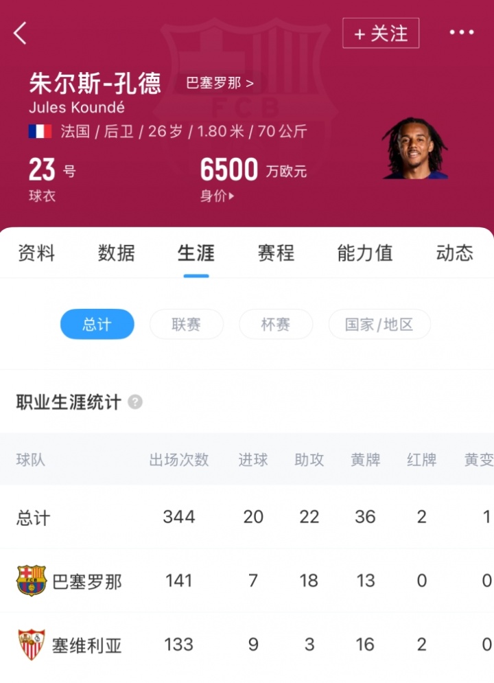 上賽季,孔德為巴薩出戰(zhàn)53場(chǎng),打進(jìn)4球助攻8次,幫助球隊(duì)奪得西甲、國王杯和西班牙超級(jí)杯冠軍。