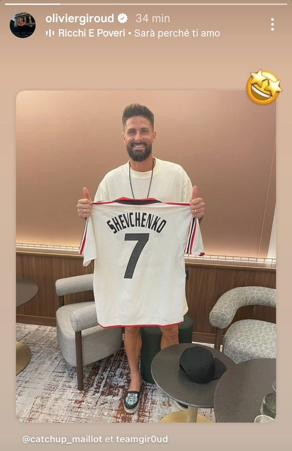 8月16日訊 不久前,吉魯更新了社交媒體,曬出了一件舍甫琴科的米蘭球衣。
