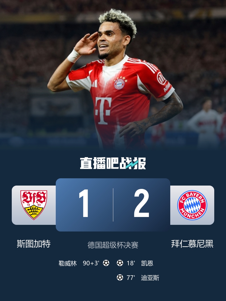 8月17日訊 北京時間8月17日02:30,德國超級杯拜仁挑戰(zhàn)斯圖加特的比賽在奔馳競技場進行,上半場格納布里推射造險,凱恩抽射首開記錄,諾伊爾獻精彩撲救,下半場諾伊爾再獻神撲,格納布里助攻迪亞斯頭球破門收獲首球,勒威林補時扳回一城,最終拜仁2-1斯圖加特問鼎德國超級杯,凱恩收獲生涯第2座冠軍。