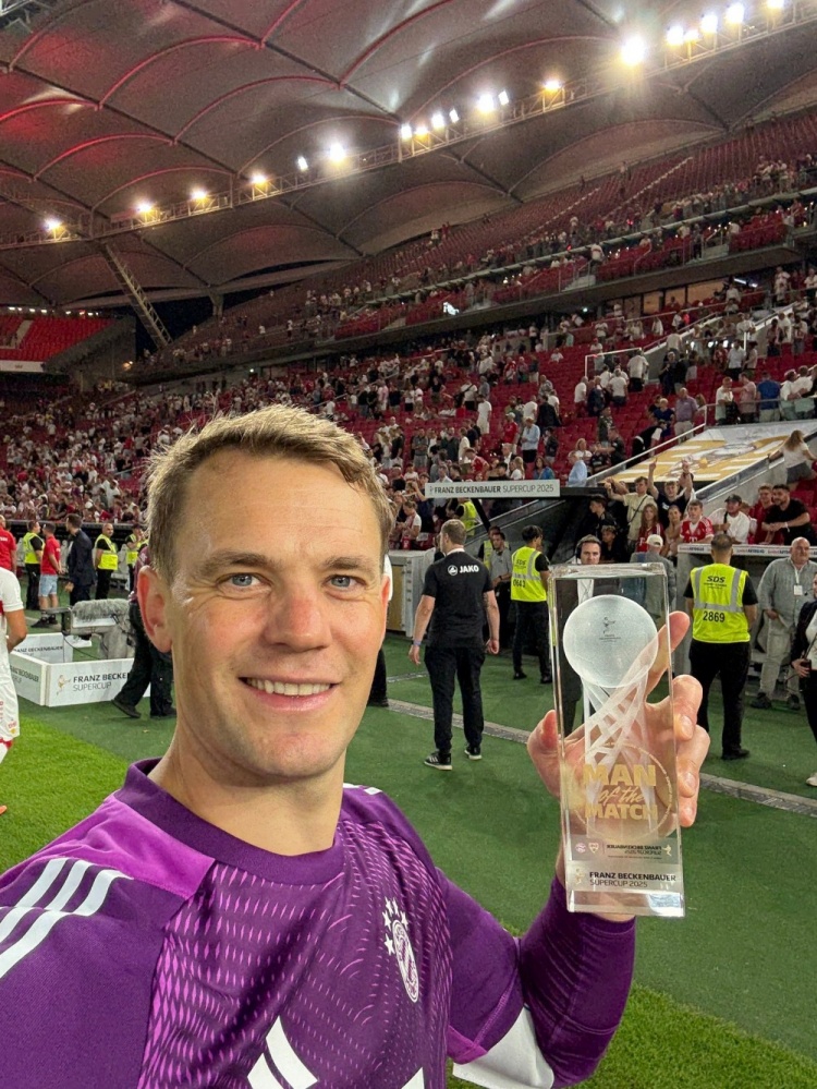 諾伊爾當選本場比賽最佳球員,他更新社媒動態(tài),曬出自己手拿全場最佳獎杯的照片。