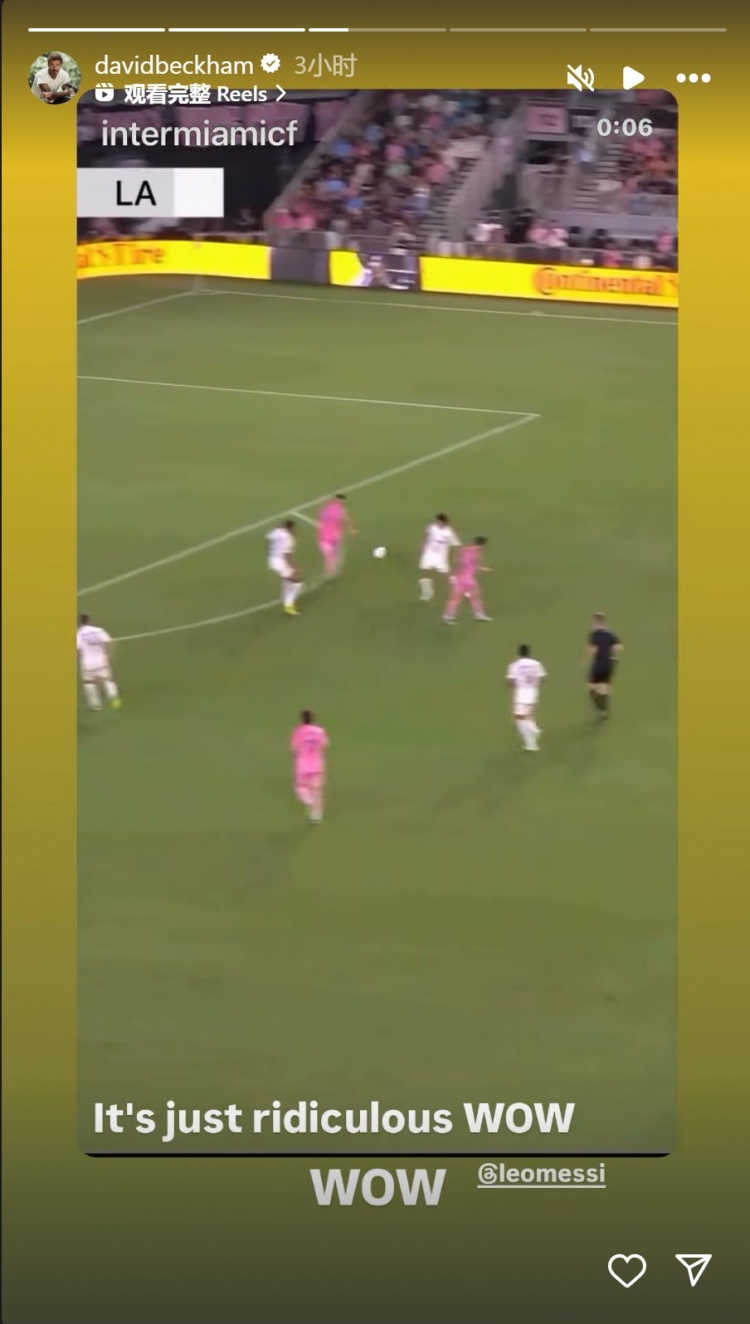 邁阿密國際老板貝克漢姆更新社媒動態(tài),轉發(fā)梅西腳后跟妙傳助攻的視頻,配文:“這簡直不可思議,哇!”