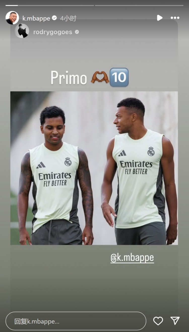 羅德里戈社媒曬出與姆巴佩的合照,配文:“兄弟。”姆巴佩轉發(fā)了這條動態(tài)。
