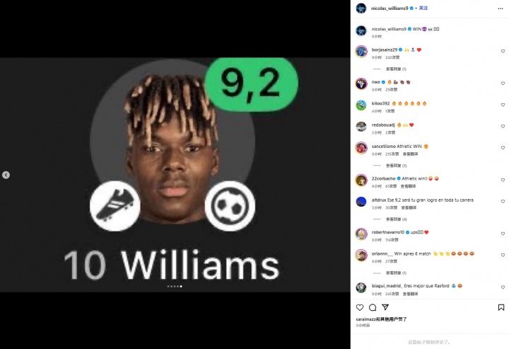 賽后,尼科在社媒曬照,其中有一張是自己本場(chǎng)評(píng)分9.2分。
