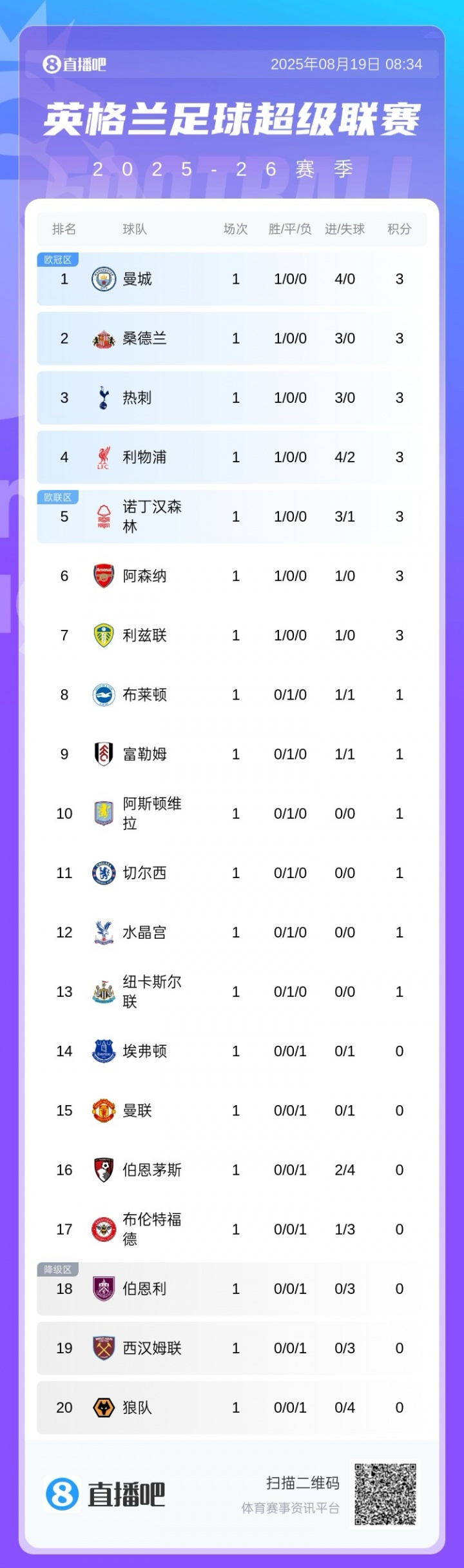 08月19日訊 今天凌晨英超聯(lián)賽首輪全部結(jié)束,曼城此前4球大勝,鎖定首輪榜首。