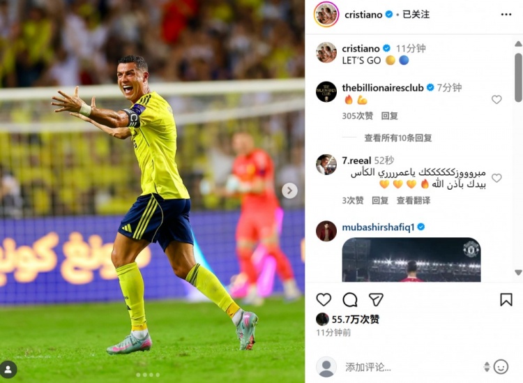 本場比賽C羅助攻菲利克斯破門,幫助球隊(duì)在10人作戰(zhàn)的不利情況下拿下勝利,賽后C羅在社媒曬出慶祝照片,配文寫道:“加油!”