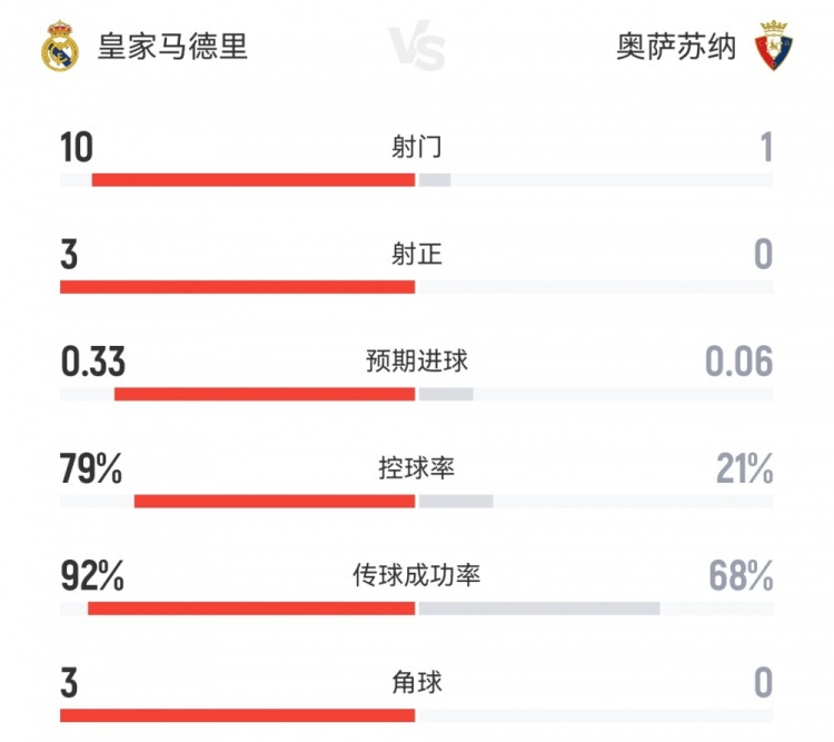 播吧8月20日訊 西甲首輪,皇馬半場(chǎng)0-0奧薩蘇納。雙方半場(chǎng)重點(diǎn)數(shù)據(jù)對(duì)比如下↓(主隊(duì)皇馬在前)