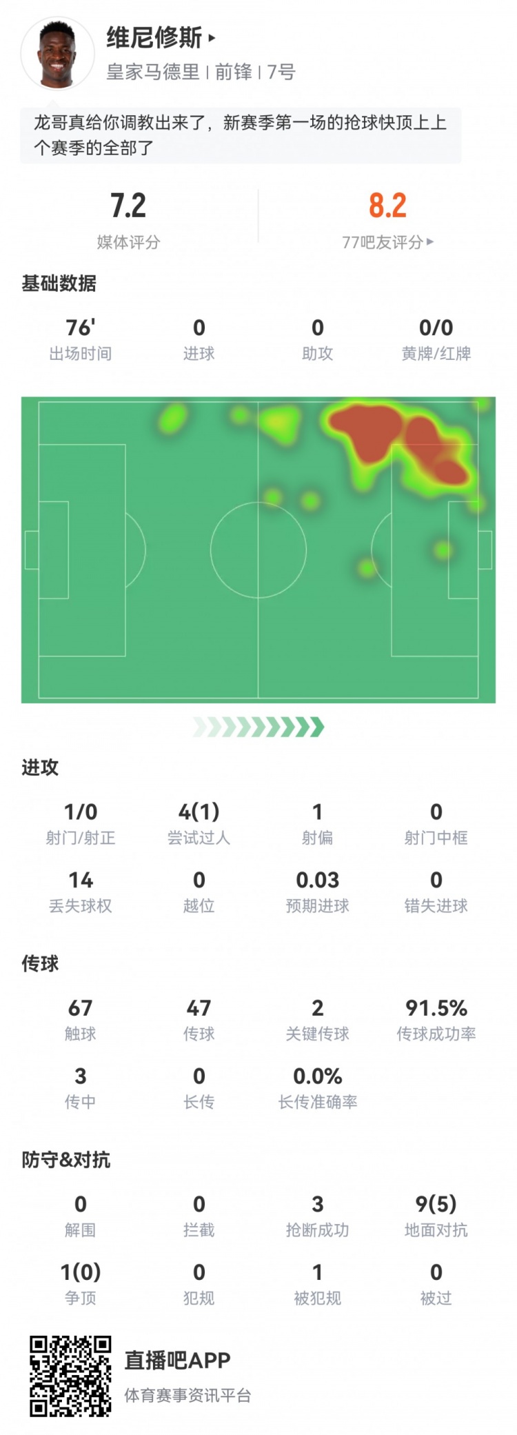 8月20日訊 西甲首輪,皇馬暫1-0奧薩蘇納。此役維尼修斯首發(fā)76分鐘被換下,球員全場重點數(shù)據(jù)如下↓