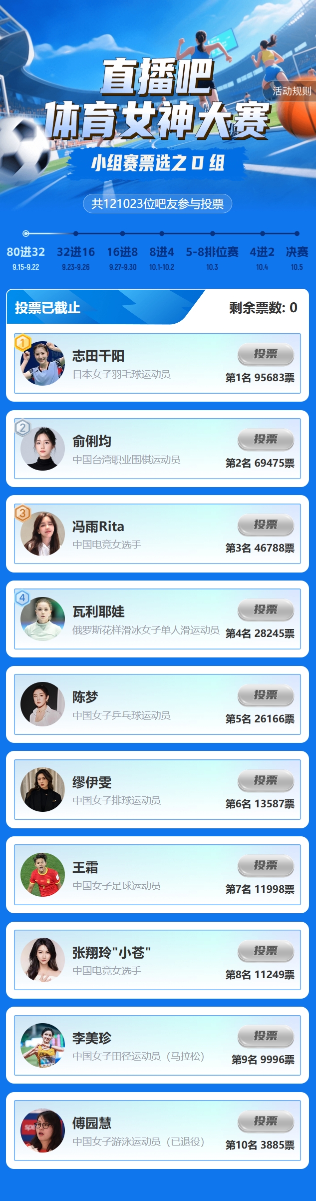 ①志田千陽(95683票)、②俞俐均(69475票)、③馮雨Rita(46788票)、④瓦利耶娃(28245票)??。