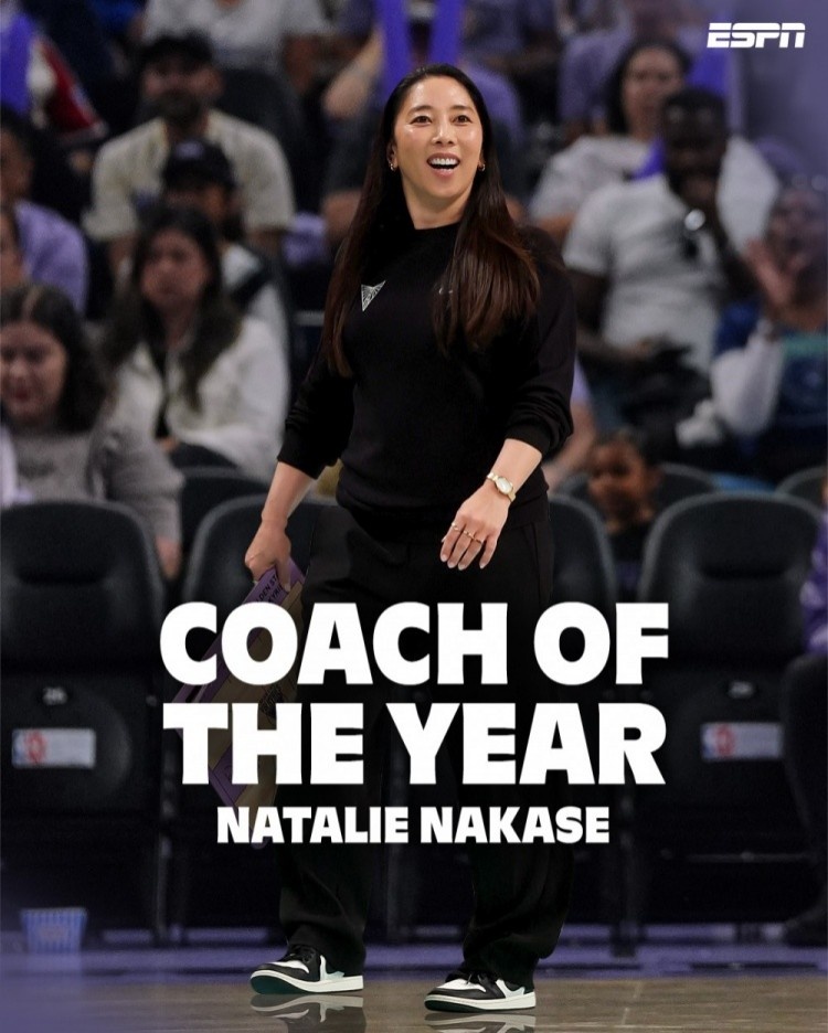 我前幾天看到了特米(法格本勒)的一段引述,她就是這么說的,我非常喜歡。這就是現(xiàn)實——通過擴(kuò)軍,用那些未受保護(hù)的球員來組建一支球隊。但我覺得奧赫瑪實際上把這看作是一件積極的事,或者說一項挑戰(zhàn),而且她打造了一套全員都憋著一股勁的陣容。所以你看到這些球員,她們既要向放走她們的球隊證明自己……也擅長做好那些小事,那些不被重視但實際上能幫助球隊贏下比賽的事情。然后再加上一位同樣充滿斗志的年度最佳教練,她強(qiáng)調(diào)防守和強(qiáng)硬——這就把一切組合成了一片充滿機(jī)遇的樂土。于是就有了:凱拉-索頓,全明星;維羅妮卡-伯頓,進(jìn)步最快球員;珍妮爾-薩隆,最佳新秀。我覺得這些個人成就恰恰說明了我們這個團(tuán)隊正在建立的文化……就好像在說:如果你想讓質(zhì)疑者們閉嘴并贏得勝利,那就來灣區(qū)吧。(無違規(guī)招募。)