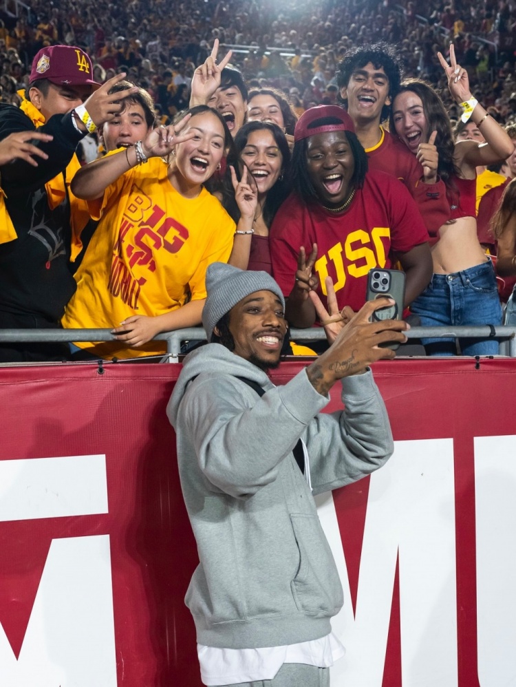 9月22日訊 南加大籃球隊(duì)社媒更新動(dòng)態(tài),曬出了校友、NBA球員德羅贊回到母校觀看校橄欖球隊(duì)的比賽照片,德羅贊在現(xiàn)場(chǎng)也是熱情的和學(xué)弟、學(xué)妹們互動(dòng)。