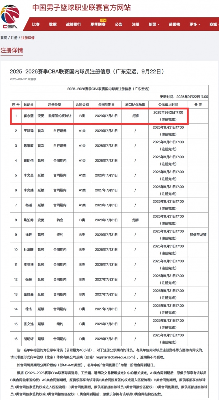 其中廣東宏遠(yuǎn)已成功為崔永熙完成注冊,并與其簽下四年B類合同,合同將于2029年7月31日到期。