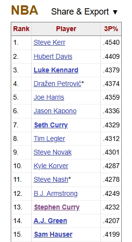 值得一提的是,賽斯-庫(kù)里的生涯三分命中率為43.29%,排名NBA歷史總榜第七,他的哥哥斯蒂芬則是42.32%,排名歷史第十三;