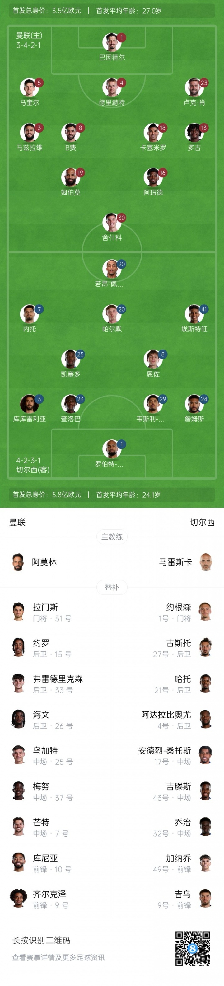 曼聯(lián)首發(fā):1-巴因德爾、23-盧克-肖、4-德里赫特、5-馬奎爾、13-多古、3-馬茲拉維、18-卡塞米羅、8-B費、19-姆伯莫、30-舍什科、16-阿瑪?shù)隆さ蟻喡?/strong>