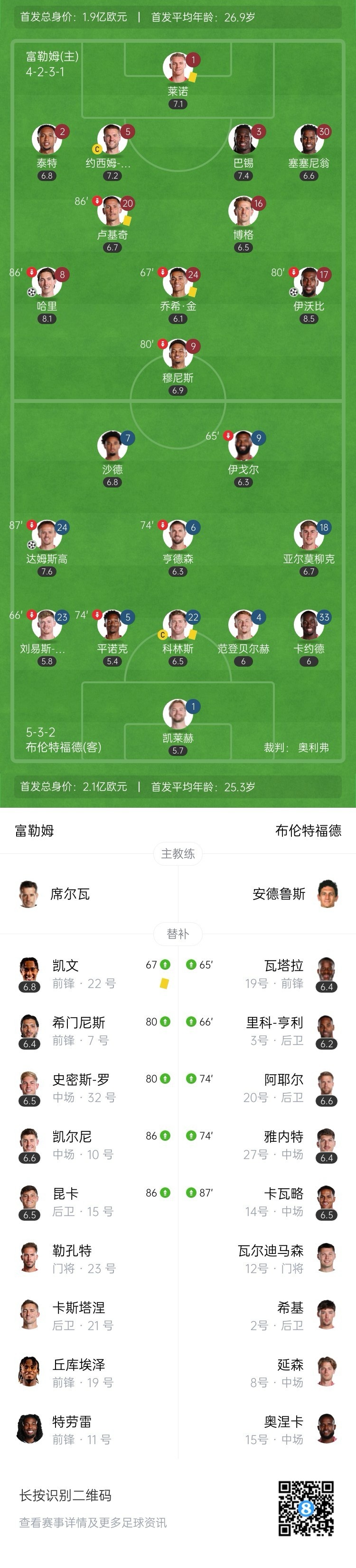 最終富勒姆3-1擊敗布倫特福德收獲英超兩連勝。
