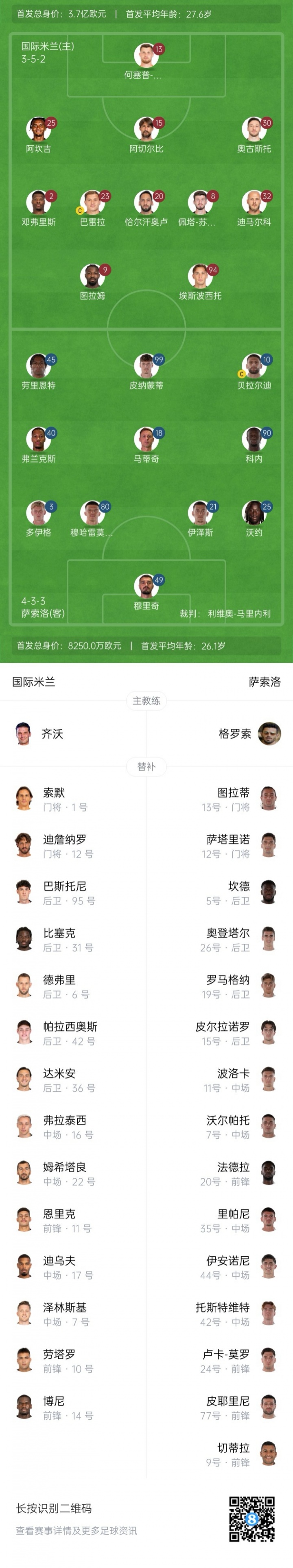 薩索洛首發(fā):49-穆里奇、25-沃約·庫利巴利、3-多伊格、21-伊澤斯、80-穆哈雷莫維奇、40-弗蘭克斯、18-馬蒂奇、90-伊斯梅爾·科內(nèi)、10-貝拉爾迪、45-勞里恩特、99-皮納蒙提