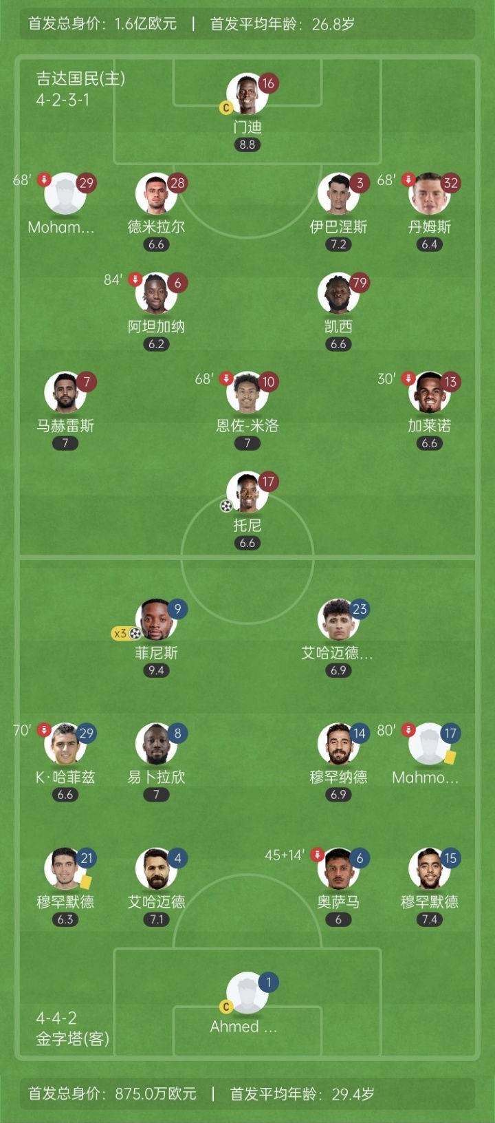 伊萬-托尼比賽中點射半場時幫助球隊扳平,不過金字塔球員梅耶爾上演帽子戲法。金字塔隊全場11次射正,最終亞冠冠軍吉達國民遭遇洲際杯出局。