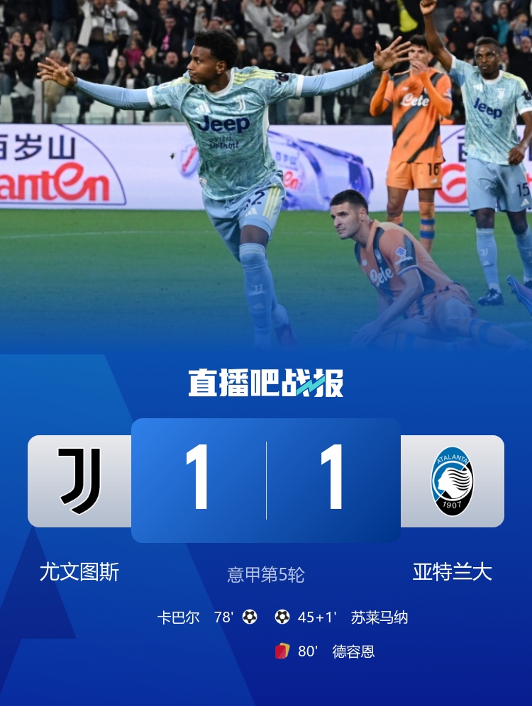 全場(chǎng)比賽結(jié)束,尤文圖斯主場(chǎng)1-1戰(zhàn)平十人亞特蘭大。