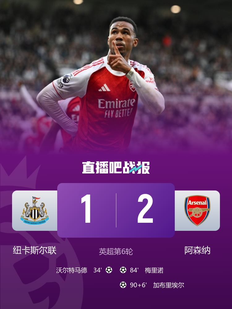 梅里諾頭球扳平比分,補(bǔ)時(shí)階段加布里埃爾絕殺!最終,阿森納2-1逆轉(zhuǎn)紐卡,距離榜首2分。