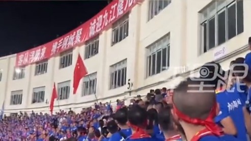 當時有球迷被人從樓上扔瓶子砸傷。目擊者稱是在新余隊進球時看到有人扔礦泉水瓶,這么高砸下來人肯定受傷了,有120到場救援,報警后6人被帶走。